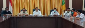 Wali Kota Sidimpuan Irsan Efendi Nasution bersama Kalak BPBD, Plt. Kasatpol PP dan Kabag Propokim saat menjelaskan jumlah kerugian dan langkah penanganan banjir yang terjadi, di aula Kantor Wali Kota, Kamis (15/12/21). (Foto:Ty)