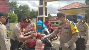 Selain masker, kapolres juga membagikan brosur dan menempelkan stiker himbauan pada kenderaan yang melintas, bertuliskan “agar tidak mudik di tahun 2020”.