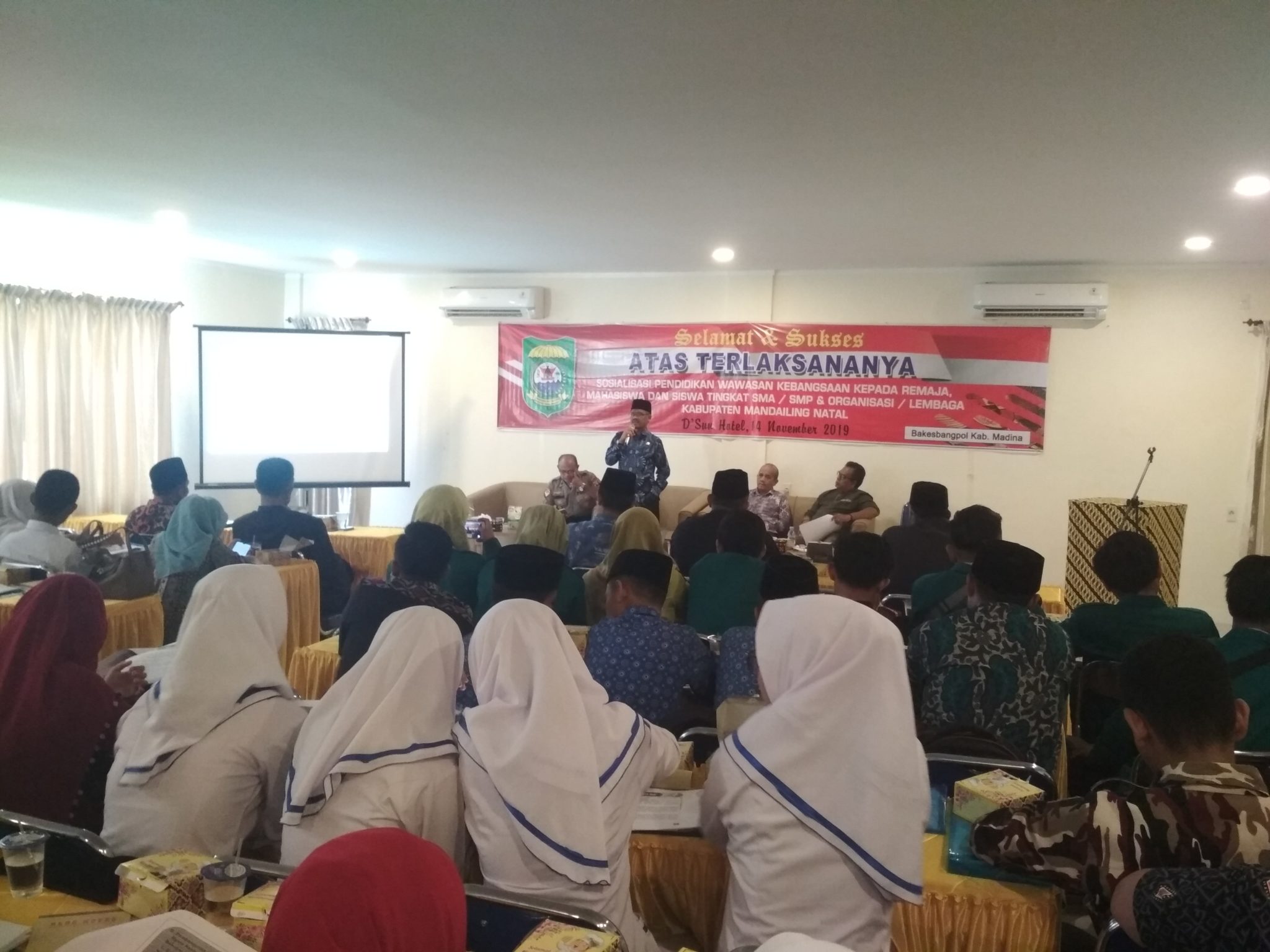 bbnewsmadina.com, Pemkab Mandailing Natal melalui Bakesbangpol menggelar sosialisasi pendidikan wawasan Kebangsaan kepada mahasiswa, siswa tingkat SMA, SMP, & Organisasi atau Lembaga di aula Hotel D’San Hotel Panyabungan, Kamis (14/11).
