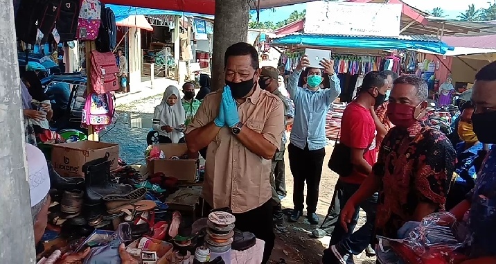 Bupati Madina Drs H. Dahlan Hasan Nasution bersama Forum Komunikasi Pimpinan Daerah (FKPD) yang turun langsung ke tengah-tengah masyarakat untuk mensosialisasikan new normal yang sekaligus membagikan masker kepada semua masyarakat yang ada dipasar, baik pedagang maupun pengunjung.