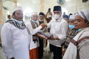 Bupati Madina Sukhairi Nasution usai melaksanakan sholat Jum’at menyerahkan bingkisan bantuan kepada BKM Mesjid Raya Al-Abror kelurahan Simangambat, Kecamatan Siabu, Jum’at (05/11/21). (Foto: istimewa)