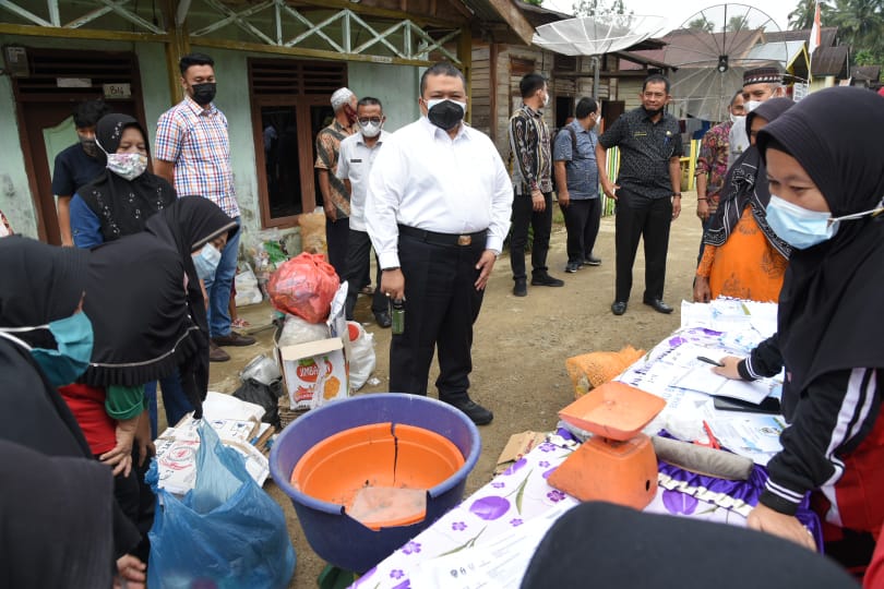 Bupati Tapanuli Selatan (Tapsel), H. Dolly Pasaribu, SPt, MM, saat meninjau kegiatan pengumpulan sampah di Bank Sampah, ‘Sarop-Sarop Jadi Sere’ (sampah-sampah jadi emas) yang kedua kalinya di Desa Siamporik Dolok, Kecamatan Angkola Selatan, Kabupaten Tapsel, Jumat (30/7). (Foto:Ty)