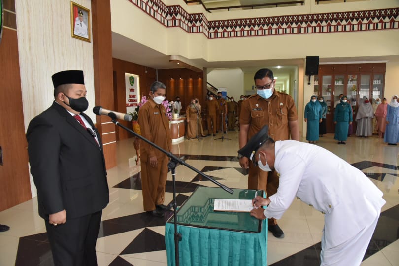 Bupati Tapanuli Selatan (Tapsel), H. Dolly Pasaribu, S.Pt, MM pada pelantikan dua Kades Pergantian Antar Waktu (PAW) di ruang lobi Kantor Bupati Tapsel, Senin (30/8) pagi. (Foto:Ty)
