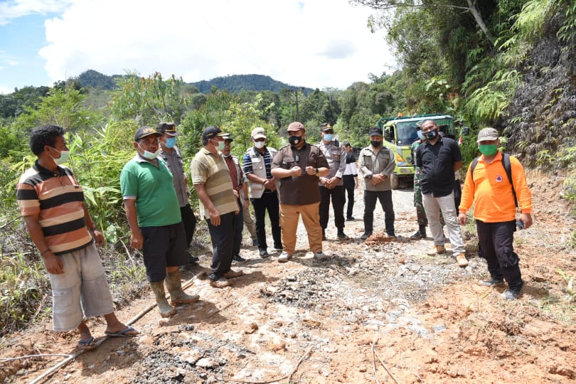 Bupati Tapsel Dolly Pasaribu saat meninjau lokasi jalan longsor di Dusun Bangun Purba, Minggu (29/08/21). (Foto:Ty)