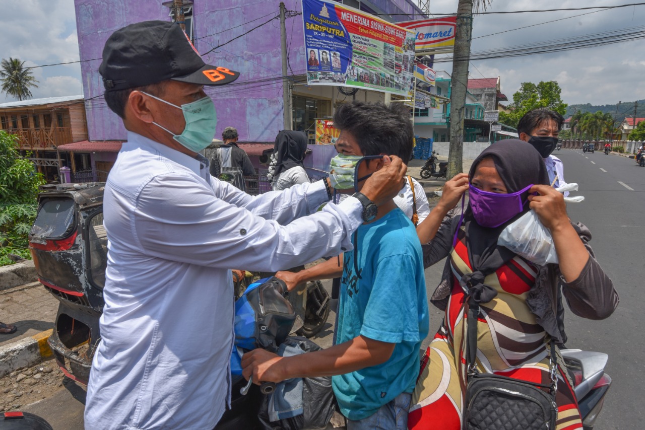 Camat Padangsidimpuan Selatan Sallim Siagian terlihat kenakan masker kepada pengendara pengguna jalan, Rabu (15/4). (Foto:Ty)
