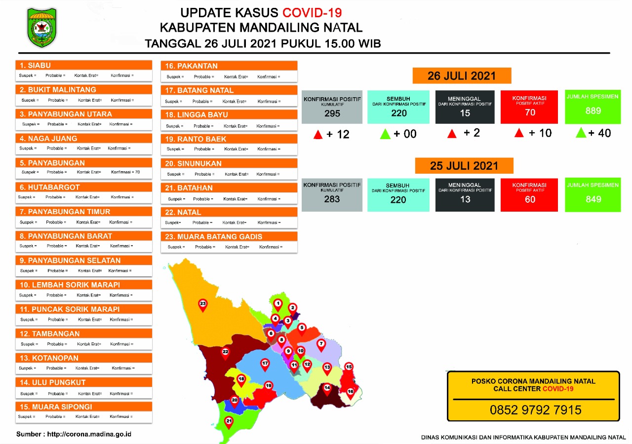 Tercatat pada sebaran Kasus Covid-19 Kabupaten Mandailing Natal pada Senin (26/07/2021) Konfirmasi Positif secara kumulatif sebanyak 295 orang, mengalami penambahan sebanyak 12 orang dari hari sebelumnya, dan Meninggal Dunia dari Konfirmasi Positif sebanyak 15 orang, yang mana ada pertambahan sebanyak 2 orang meninggal Dunia, di hari sebelumnya Minggu (25/07/2021) tercatat Pasien Konfirmasi Positif yang meninggal Dunia sebanyak 13 orang.