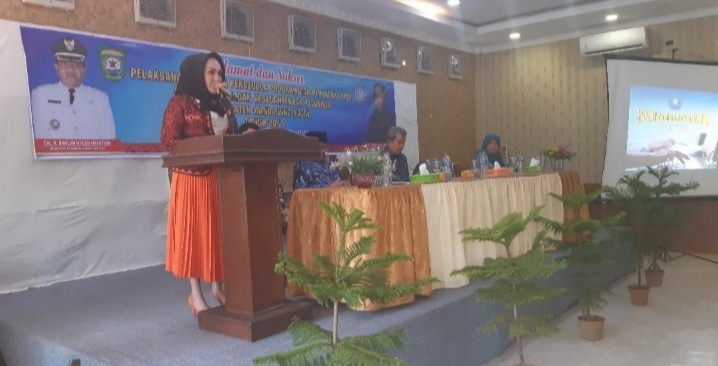 Ketua TP PKK Madina, Ny Ika Desika Dahlan Hasan saat berpidato dalam pembukaan acara kegiatan LP3 PKK Madina yang diadakan Dinas PMD Madina, diaula Hotel Rindang Kelurahan Dalan Lidang Panyabungan, Jum’at (13/13).(Foto:LBS)