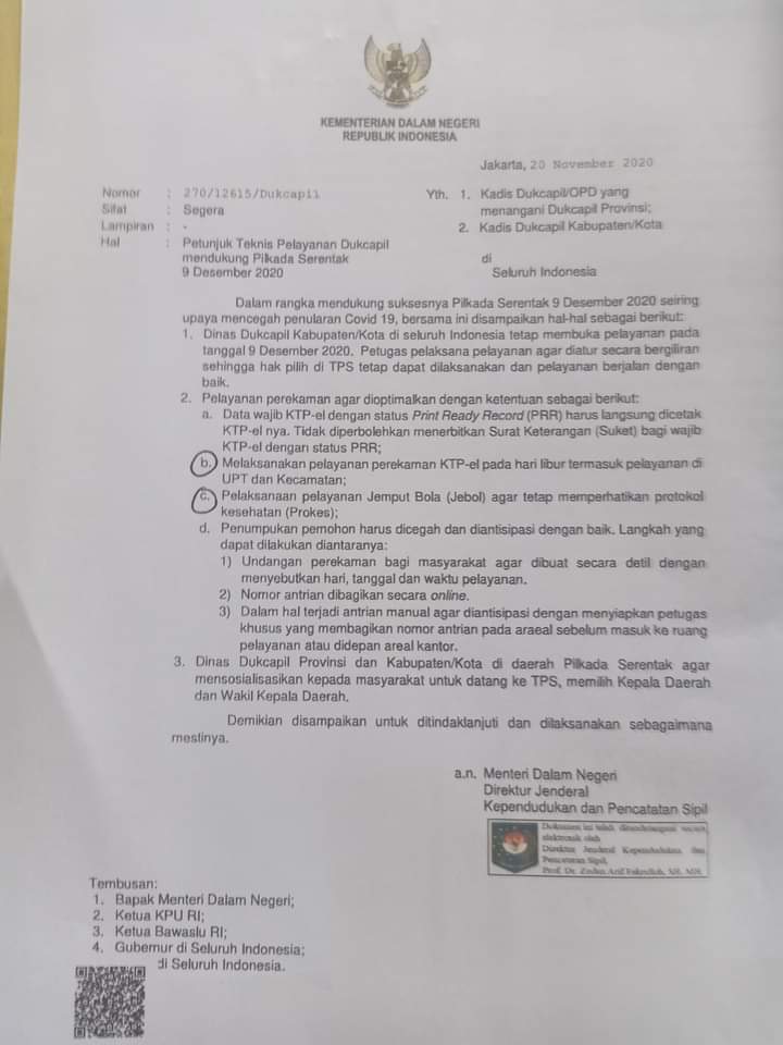 Sesuai dengan arahan dari Menteri Dalam Negeri melalui Dirjen Kependudukan dan Pencatatan Sipil yang tertuang dalam surat Edaran Menteri Dalam Negeri Nomor : 270/12615/Dukcapil, Hal : Petunjuk Tekhnis Pelayanan Dukcapil Mendukung Pilkada Serentak 9 Desember 2020.