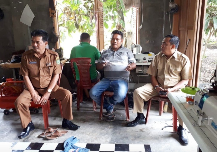 Kadis Kominfo Madina Sahnan Pasaribu didampingi Sekretaris Asmara Hadi saat berkunjung kepembuatan sepatu kulit di Desa simalagi, Rabu (16/10).(Foto : LBS)