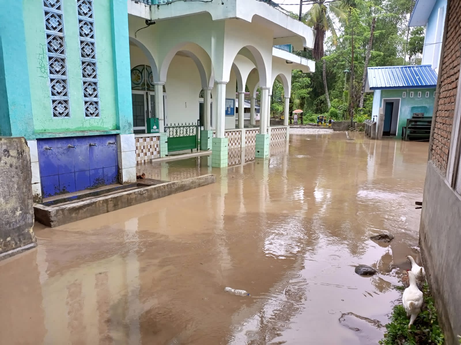 Masjid Al Abror Panyabungan Jae dan Masjid Miftahul Jannah Huta Lombang Lubis di terjang banjir luapan sungai Aek mata, akibat tingginya curah hujan yang mengguyur kota Panyabungan mulai Jum’at (17/12/21) sore hingga Sabtu (18/12/21) pagi. (Foto:SNP)