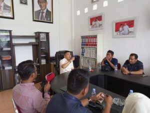 Erwin Efendi Lubis SH saat menggelar konferensi pers atas polimik tari ular yang menghebohkan Madina belakangan ini, di kantor Gerindra, Senin (31/01/22). (Foto:SNP)