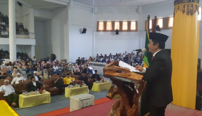 Foto : Ketua DPRD Madina sementara, Erwin Efendi Lubis saat memberikan sambutannya di sela acara rapat paripurna pengucapan sumpah dan janji 40 anggota DPRD Madina periode 2019-2024n senin (2/9) digedung serbaguna desa Parbangunan Panyabungan Madina. (JBL)