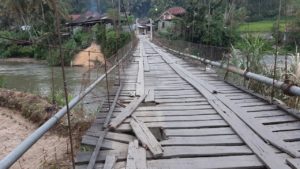 Dari keterangan warga di lokasi, kondisi itu sudah berlangsung sejak sekitar dua atau tiga bulan belakangan ini. Kondisi jembatan sudah berulang kali diperbaiki warga menggunakan peralatan seadanya karena keterbatasan dana.