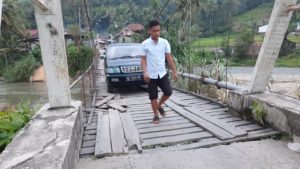 Pengemudi mobil itu tampak sangat berhati-hati, bahkan penumpang di dalam mobil juga harus turun untuk memperbaiki kayu-kayu di jembatan agar roda kendaraannya tidak terjatuh yang bisa membahayakan keselamatannya.