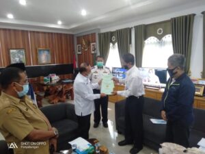Sebelum menyerahkan 3 (Tiga) Sertifikat tanah seluas 18 Hektar sebagai tambahan lahan Bandara Bukit Malintang, Pjs Bupati Mandailing Natal, H. Dahler Lubis menerima penjelasan rencana pembangunan Run Way Bandara Bukit Malintang dari Kepala Dinas Perhubungan Kabupaten Mandailing Natal Hendra AP,MM yang mendapingi Team Direktorat Perhubungan Udara untuk pembangunan Bandara Bukit Malintang.