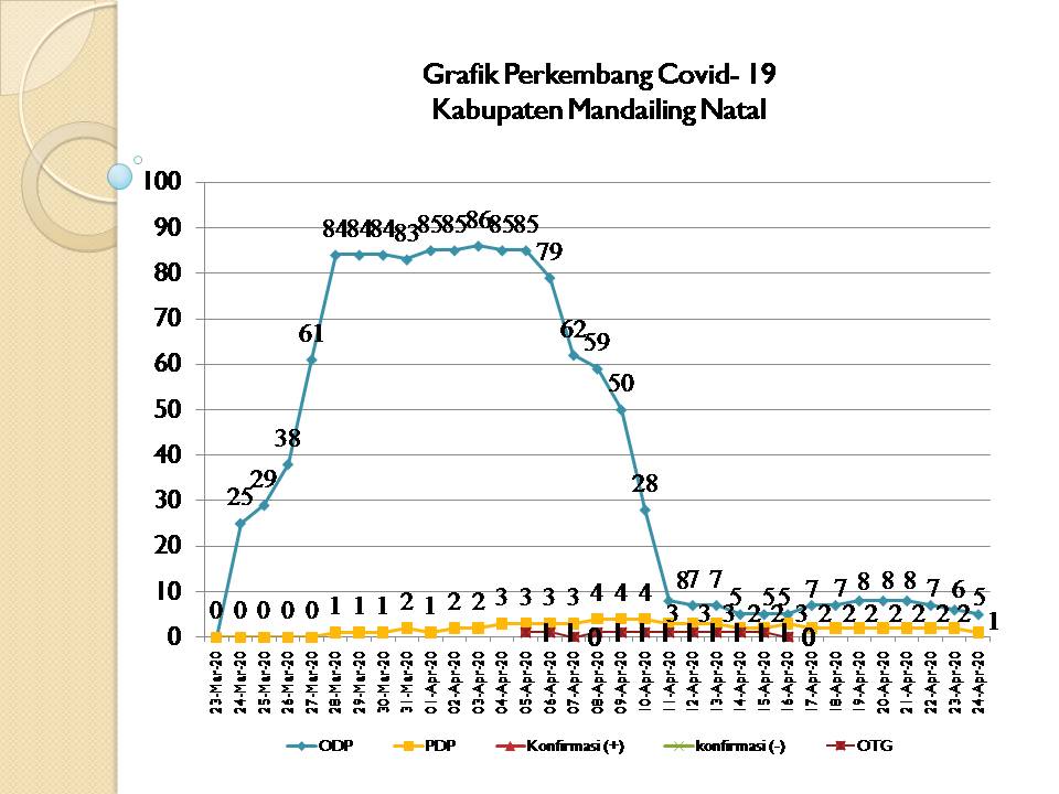 bbnewsmadina.com, Peta perkembangan penanganan Covid-19 Madina per tanggal 24 April 2020 meng update data terbaru dengan menurunnya jumlah PDP dan ODP, dimana hasil perkembangan hari ini yaitu, 5 ODP, 1 PDP, OTG Nihil, dan Konfirmasi (Pasien Positif Covid-19) Nihil, dengan total 6 orang.