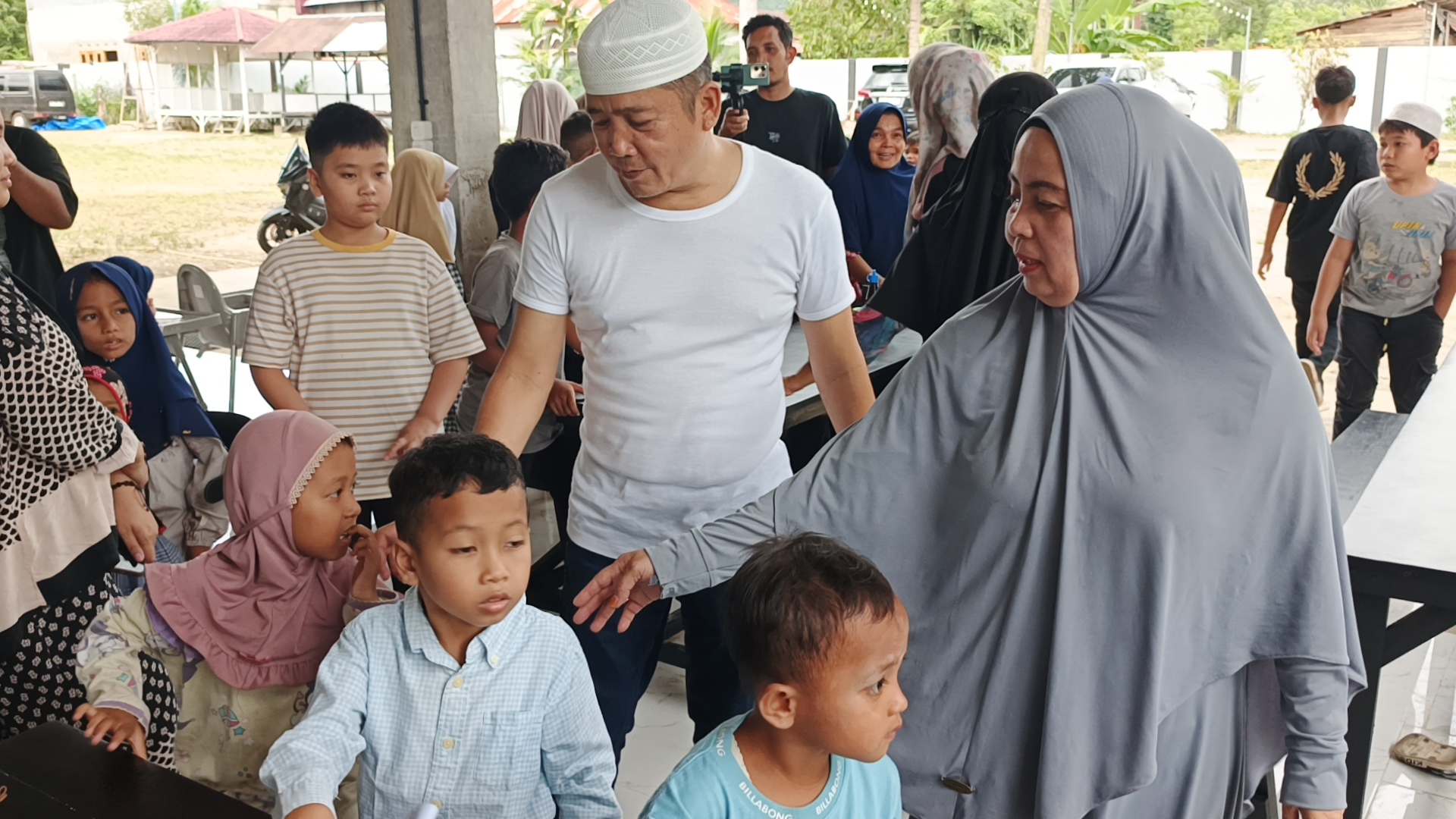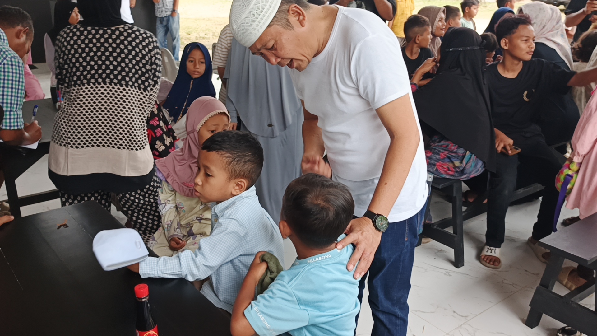 Terlihat owner Warkop Madina H. Erwin Efendi Lubis didampingi oleh keluarga memberikan kebahagiaan kepada anak anak yatim piatu.