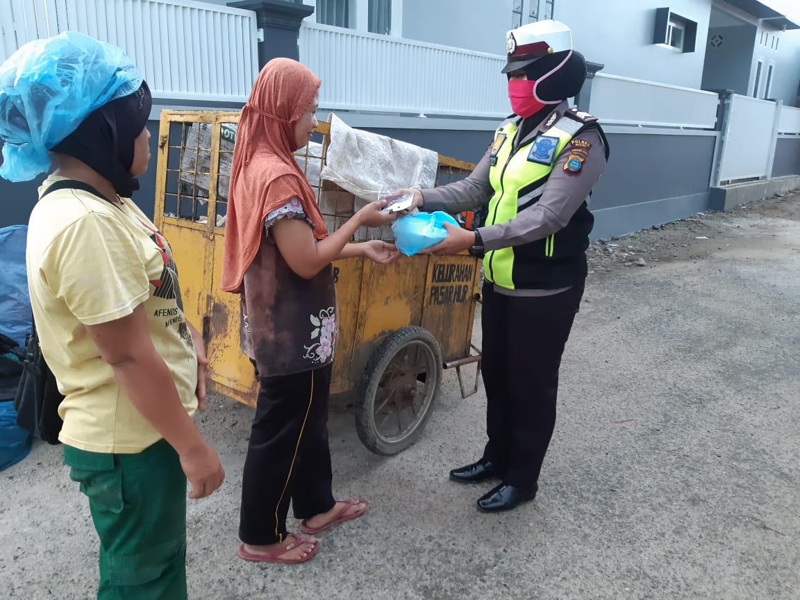 Polwan Sat Lantas saat bagikan nasi bungkus kepada warga yang membutuhkan, Jum’at (17/07).