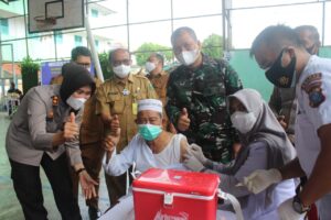 Kapolres Padangsidimpuan AKBP. Juliani Prihartini, SIK,MH bersama Bapak H. Abdul Jalil Siregar (Pakai Lebai) saat Vaksinasi Lansia di Gedung Sari Putra, Selasa ( 22/6). (Foto:Ty)