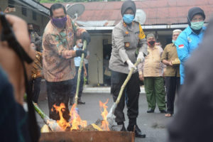 bbnewsmadina.com, Kapolres Kota Padangsidimpuan, AKBP. Juliani Prihartini,SIk,MH dan Wali Kota Irsan Efendi Nasution,SH pimpin langsung pemusnahan barang bukti narkotika jenis ganja di halaman Mapolres, Jalan Serma Lian Kosong, Kamis (16/4).