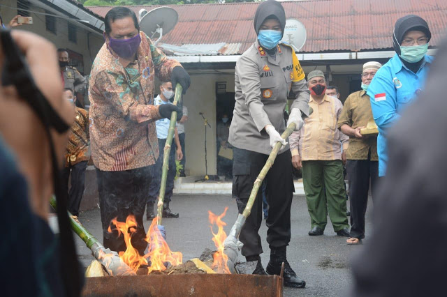 bbnewsmadina.com, Kapolres Kota Padangsidimpuan, AKBP. Juliani Prihartini,SIk,MH dan Wali Kota Irsan Efendi Nasution,SH pimpin langsung pemusnahan barang bukti narkotika jenis ganja di halaman Mapolres, Jalan Serma Lian Kosong, Kamis (16/4).