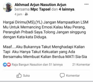 Sebelumnya, akun Facebook @Ahmad Arjun Nasution Arjun memuat postingan ancaman yang berbunyi ”Hargai dirimu (MS), (YL) jangan manfaatkan LSM mu untuk memancing emosi. Kalau mau perang, peranglah pribadi saya. Tolong jangan singgung dengan kata-kata diduga. Maaf aku bukannya takut menghadapi kalian tapi aku hanya takut kekuatan yang ada bersamaku membuat kalian berdua MATI sia-sia”. (SNP)