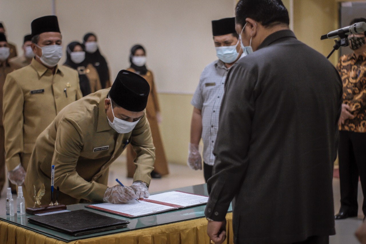 Wali Kota Padangsidimpuan Irsan Efendi Nasution, SH kukuhkan 87 ASN Jabatan Pimpinan Tinggi Pratama, Jabatan Atdministrator, Jabatan Pengawas dan Jabatan Pelaksana di Lingkungan Pemerintah Kota Padangsidimpuan, Jum’at (18/6/2021). (Foto:Ty)
