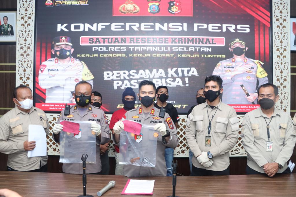 Kapolres Tapanuli Selatan ( Tapsel) AKBP. Roman Smaradhana Elhaj, SH, SIk, MH saat Konfrensi Pers terkait kepemilikan Senjata Api Ilegal oleh warga sipil RRS. (Foto:Ty)