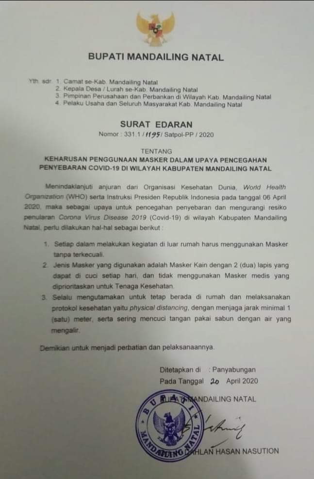 “Dan ini untuk menindaklanjuti anjuran dari Organisasi Kesahatan Dunia World Healt Organization (WHO) serta instruksi Presiden Republik Indonesia pada tanggal 06 April 2020, dalam upaya pencegahan penyebaran virus dan mengurangi resiko penularan Covid-19,” pungkas Bupati Madina. (MS)