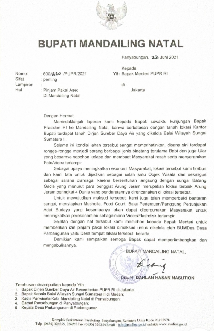 Surat tersebut juga ditembuskan kepada Dirjen Daya Air Kementerian PUPR RI di Jakarta, Kepala Balai Wilayah Sungai Sumatera II di Medan, Kadis Pariwisata Mandailing Natal, Camat Panyabungan, dan Kepala Desa Parbangunan. (DN)
