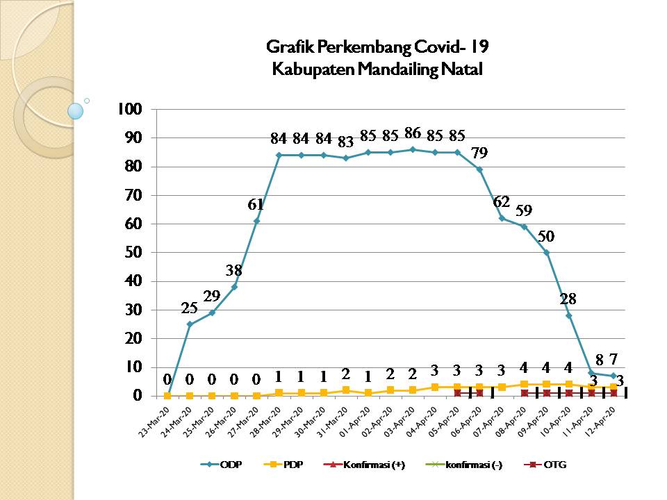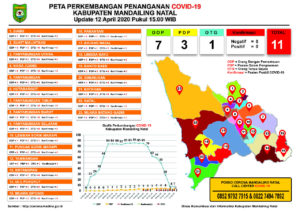 Keterangan yang dirilis Diskominfo Madina : Orang Dalam Pantauan (ODP) 7 orang, Pasien Dalam Pengawasan (PDP) 3 orang, Orang Tanpa Gejala (OTG) 1 orang, dan Konfirmasi (Pasien Positif Covid-19) nihil dengan Total 11 orang.