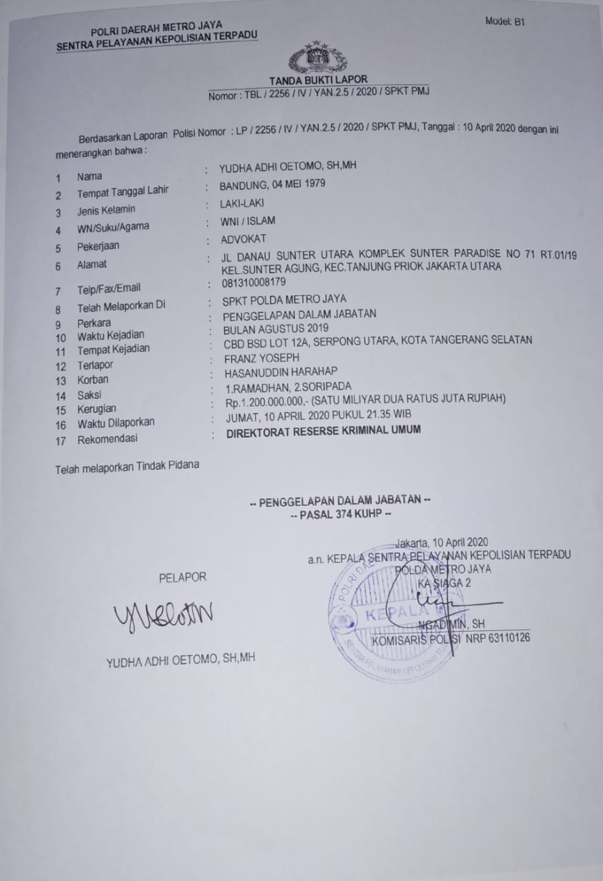Laporan tersebut tercatat dengan Nomor: LP/2256/IV/YAN.2.5/2020/SPKT.PMJ, Tanggal 10 April 2020, atas nama Pelapor Yudha Adhi Oetomo, SH.MH selaku Tim Penasehat Hukum Hasanuddin Harahap.