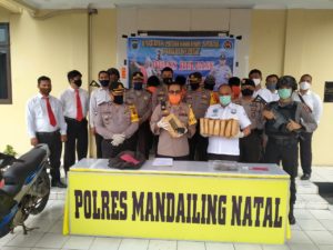 “Pada TKP kedua hari Selasa tanggal 07 Juli 2020 sekira pukul 22.00 Wib, kami berhasil mengamankan Tersangka IMS (21) Tahun warga Kota Padang Sidempuan dan DH (25) Tahun warga Kota Padang Sidempuan dengan barang bukti yang berhasil diamankan berupa : 8.250 (delapan ribu dua ratus lima puluh) gram ganja kering dan 1 (satu) unit Sepeda Motor YAMAHA Jupiter MX warna biru silver tanpa Nopol,” papar Kapolres.