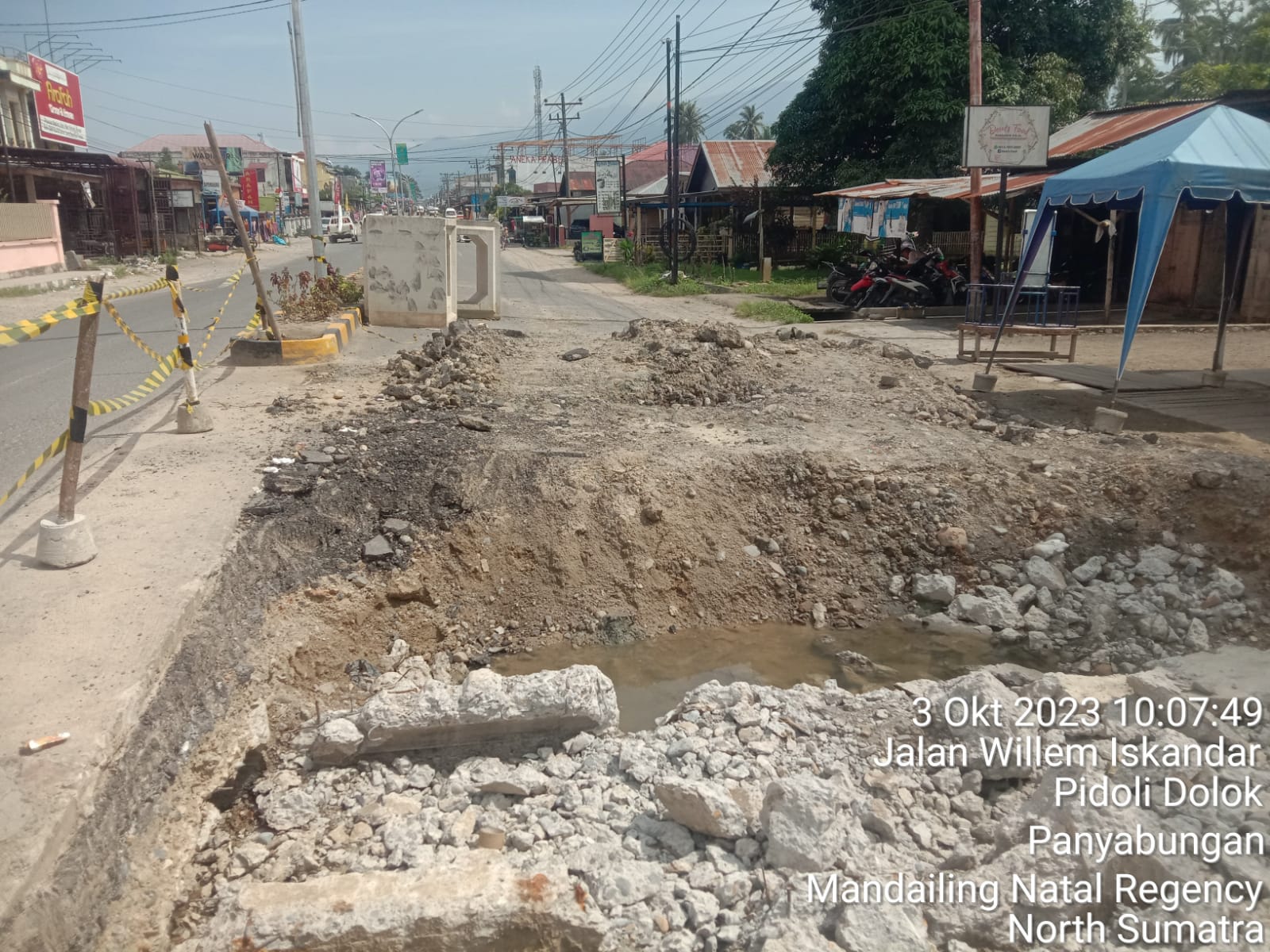 bbnewsmadina.com, – MandailingNatal, – Sejumlah warga memelototi plank merk di jantung Kota Panyabungan, Jalan Willem Iskander, Pidolidolok, Panyabungan, Kab. Mandailingnatal, Selasa (4/10). “Longsor” Panyabungan?