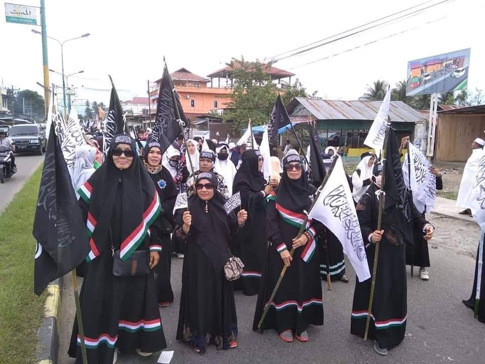 Pantuan bbnewsmadina.com, massa yang berdatangan dari berbagai ormas Islam, OKP, tokoh agama dan masyarakat membawa bendera bertuliskan kalimat tauhid, serta memakai baju, topi dan pengikat kepala yang bertuliskan kalimat tauhid “Laailahaillauloh, Muhammadarosululloh”.