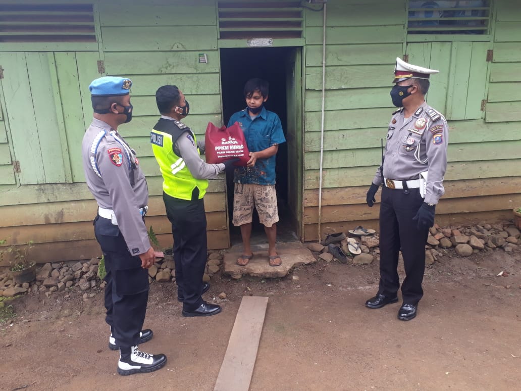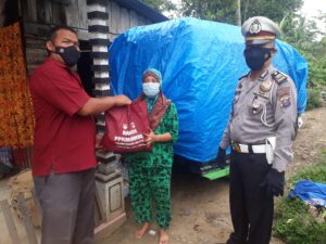 Personil Polres Tapsel saat membagikan paket Bansos PPKM Mikro kepada salah satu warga di Desa Sinyior, Kamis (02/09/21). (Foto:Ty)
