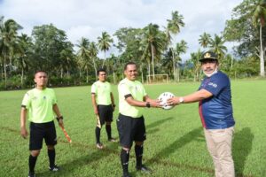 Sekda Parulian Nasution saat membuka Turnamen Sepakbola memperebutkan Piala Perbakin Cup I Tahun 2021 di Desa Janji Mauli, Kecamatan Angkola Muaratais, Kabupaten Tapsel, Jumat (2/4). Foto:Ty