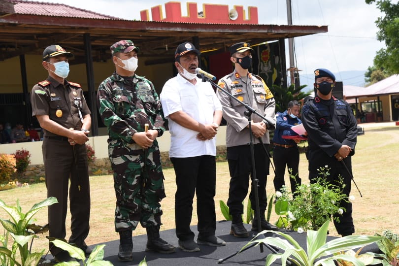 Sekda Parulian Nasution saat Apel gabungan dan simulasi Tagana di lapangan Mako Brimob Yon C Sipirok, di Desa Marisi, Kecamatan Angkola Timur, Kabupaten Tapsel, Kamis (8/4). Foto:Ty