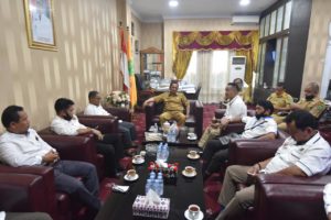 Wali Kota Sidimpuan Irsan Efendi Nasution bersama Kadis Kominfo Islahuddin Nasutuon, Kabag Protokol dan Komunikasi Pimpinan Nurcahyo Budi Susetyo saat menerima audensi pengurus PWI Tabagsel periode 2020-2023. (Foto:Ty)