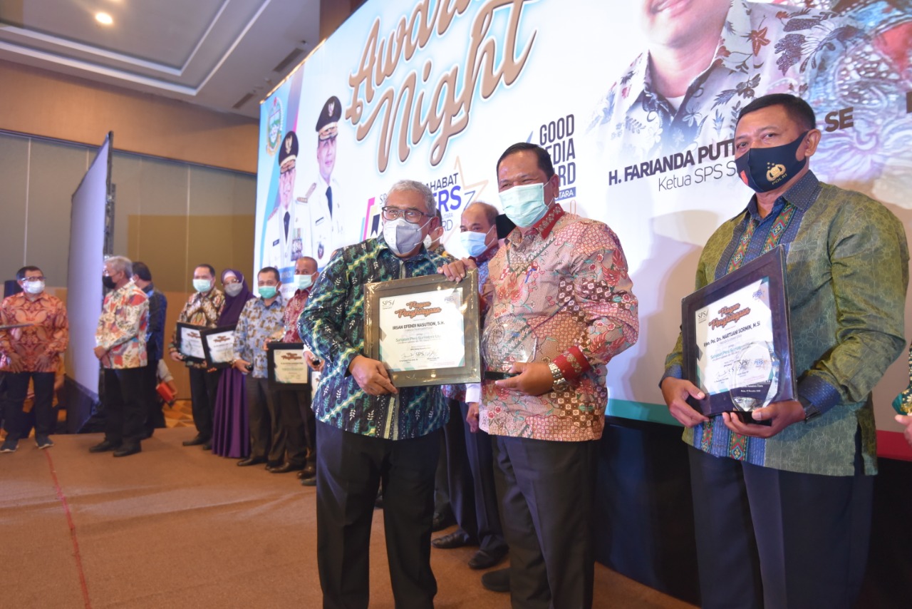 bbnewsmadina.com, Wali Kota Padangsidimpuan Irsan Efendi Nasution, SH bersama sejumlah Wali Kota/Bupati dan Tokoh di Sumatera Utara mendapat penghargaan sebagai “Anugerah Sahabat Pers” dari Serikat Perusahan Pers (SPS) Cabang Sumut.