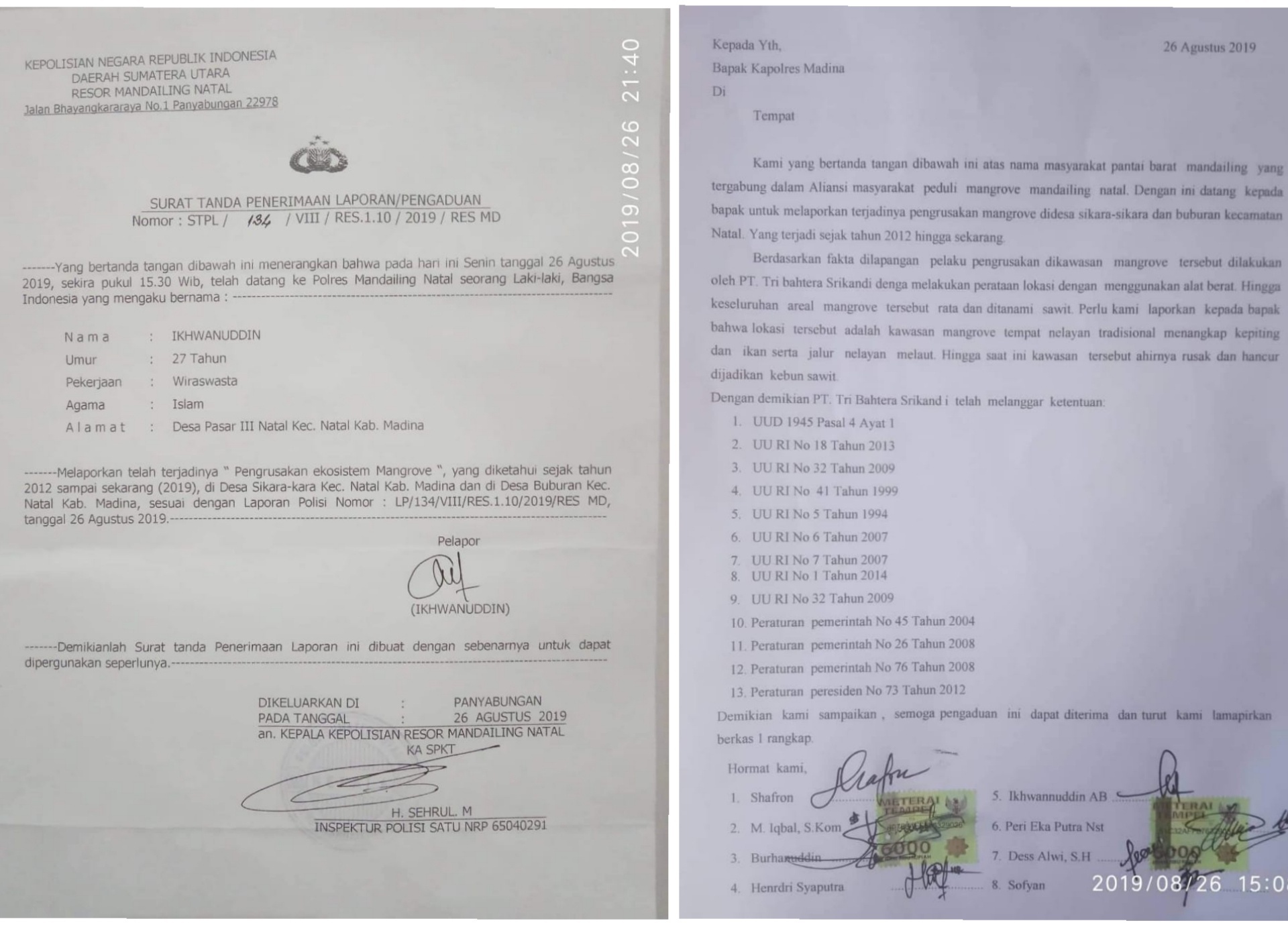 Laporan Ikhwanuddin bersama 7 orang rekannya yang tergabung dalam Aliansi Masyarakat Peduli Mangrove Mandailing Natal (AMP2MN) yakni Safron, M Iqbal, S. Kom, Burhanuddin, Hendri Syahputra, Peri Eka Putra Nasution, Dess Alwi, SH dan Sofyan tertuang dalam laporan polisi nomor : LP/134/VIII/RES.1.10/2019/RES.MD tertanggal 26 Agustus 2019 yang ditandatangani oleh IPTU H Sehrul M.