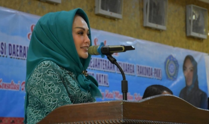 Ketua TP PKK Madina, Ny Ika Desika Dahlan Hasan saat menyampaikan pidatonya di acara rakon PKK Madina tahun 2019 diaula hotel Rindang Kelurahan Dalan Lidang Panyabungan, Jim’at (14/12). (Foto:LBS)