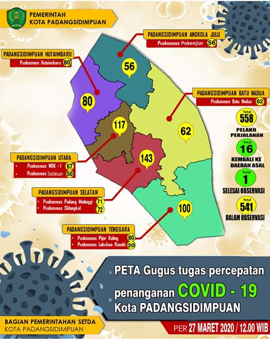 bbnewsmadina.com, Gugus Tugas Percepatan Penanganan (PP) Corana Virus Desease 2019 (Covid-19) Kota Padangsidimpuan kembali merilis data terbaru Pelaku Perjalanan yang didatangi dan melaporkan diri pada Jumat (27/3) pukul 12:00.