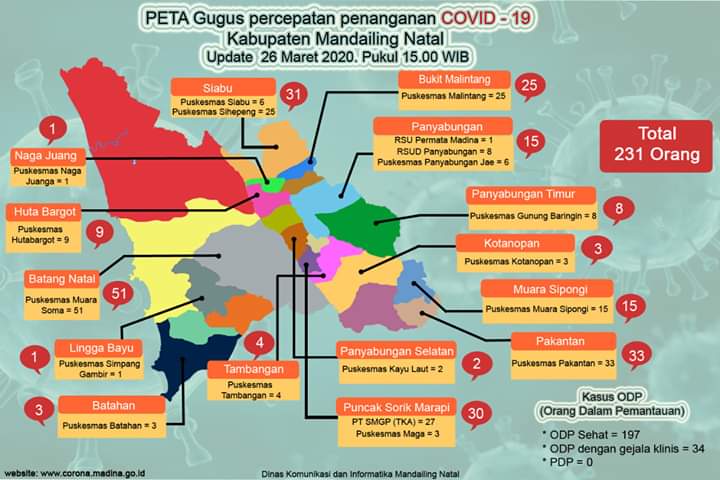 bbnewsmadina.com, Tim gugus tugas percepatan penanganan virus Corona Kabupaten Madina meng update data per hari ini, Kamis tanggal 25 Maret 2020 pukul : 15.00 WIB Orang Dalam Pantauan (ODP) dengan Total 231 Orang.