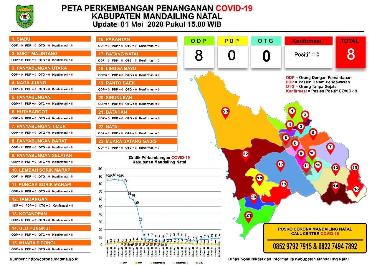 Peta Perkembangan Penanganan Covid-19 Madina Tanggal 01 Mei 2020. (Foto: Diskominfo Madina)