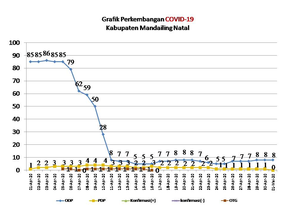 Data dari Tim Gugus Tugas Covid-19 Madina melalui Kadis Kominfo, Sahnan Pasaribu mengatakan bahwa 1 orang Pasien Dalam Pengawasan (PDP) yang berada di RSUD Padangsidimpuan sudah selesai masa perawatannya, dan berdasarkan hasil uji Swab pasien negatif covid-19.