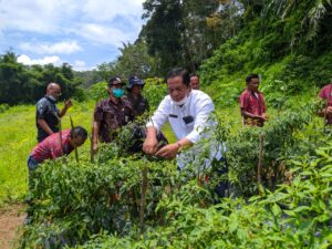 Wali Kota Padang Sidempuan Irsan Efendi Nasution SH saat Penen perdana demplot cabai merah di Desa Bargot Topong, Kamis (24/02/22). (Foto:Ty)