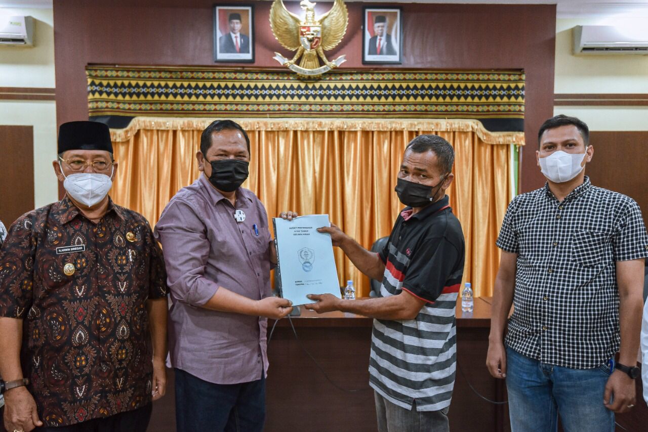Wali Kota Padangsidimpuan Irsan Efendi Nasution SH saat menerima hibah tanah dari Marahot Harahap untuk pembangunan SMP N Hanopan diaula Kantor Wali Kota, Jum’at (20/08/21). (Foto:Ty)