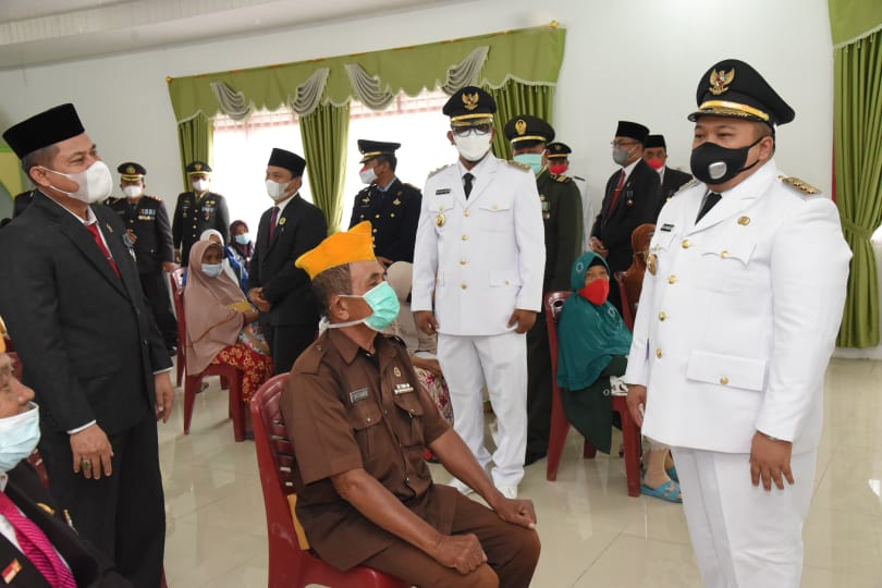 Bupati Tapanuli Selatan (Tapsel), H. Dolly Pasaribu, S.Pt,MM, menyerahkan tali asih kepada 24 Veteran secara simbolis seusai pelaksanaan peringatan Hari Ulang Tahun (HUT) Kemerdekaan Republik Indonesia (RI) ke-76 di Aula Kantor Camat Sipirok, Selasa (17/8). (Foto:Ty)
